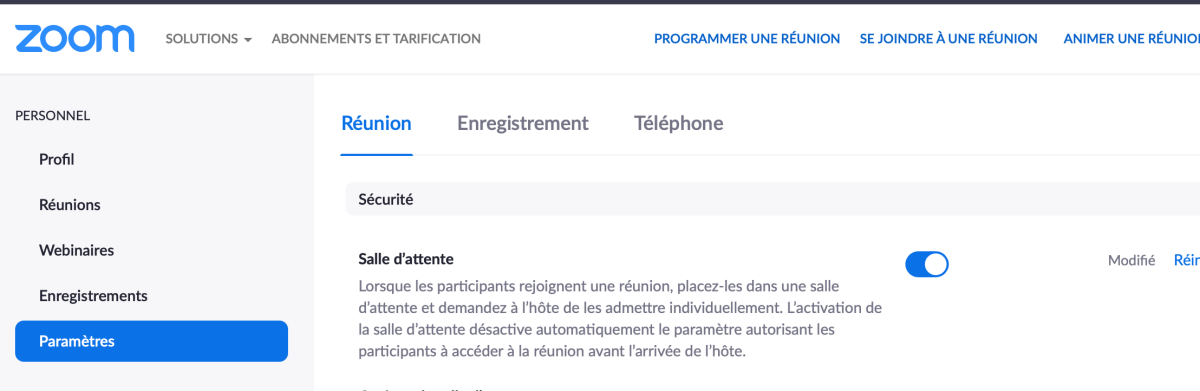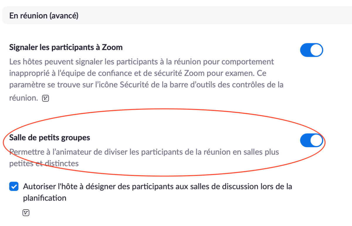 Je clique sur le lien « Paramètres ». Je fais défiler la page vers le bas jusqu’à « En réunion (avancé) ». J'active l'option « salle de petits groupes ».