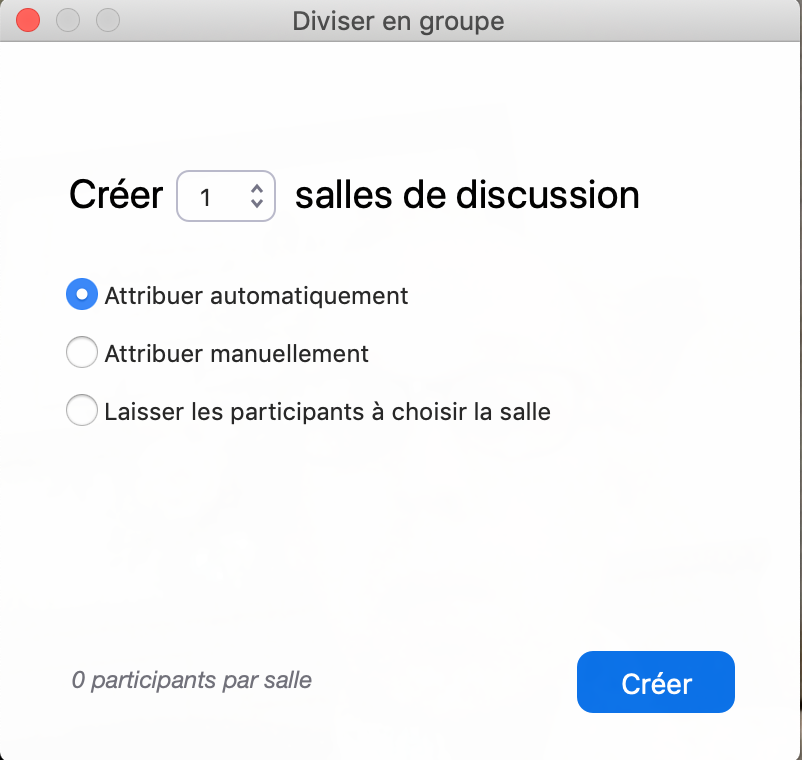 Dans la nouvelle fenêtre, je choisis le nombre de groupes (Zoom calcule automatiquement le nombre de participants par salle) et la méthode d’affection des participants dans les groupes : Automatiquement ou Manuellement. Je clique ensuite sur le bouton « Créer ».