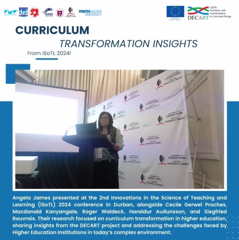 On 26-27 September 2024, Angela James presented at the 2nd Innovations in the Science of Teaching and Learning (iSoTL) conference in Durban, South Africa. Collaborating with co-authors Cecile Gerwel Proches, Macdonald Kanyangale, Roger Waldeck, Haraldur Auðunsson, and Siegfried Rouvrais, the team shared their research titled “Unpacking curriculum transformation in higher educational institutions in a volatile, uncertain, complex, and ambiguous world: Insights from the DECART project.”