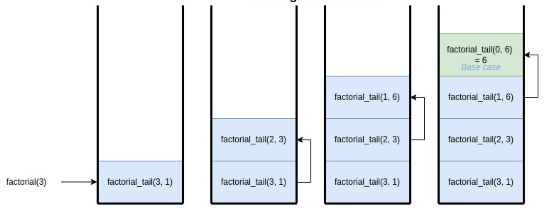 Lorsque nous utilisons une pile récursive (par exemple dans une fonction récursive simple), la taille de la pile utilise de la mémoire en attendant les résultats récursifs. Dans ces cas là, la complexité dans le pire des cas est la taille maximum de la pile durant le déroulé de l’algorithme (nombre de niveaux d’appels). C’est donc généralement en $O(n)$. Reprenons l’exemple donné dans le cours d’algorithme 2 avec factoriel(3) :