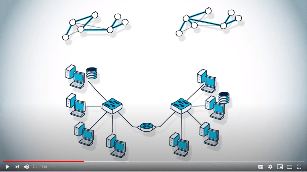 Dans cet exemple, il faut 7 sauts pour aller de $v_1$ à $v_2$, malgré le fait qu’ils pourraient être reliés en seulement 1 saut.