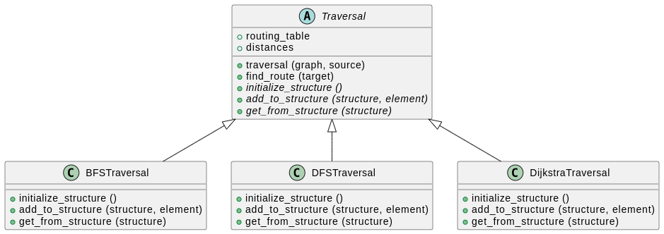 Si vous avez suivi la partie optionnelle de la session précédente, vous devriez avoir factorisé vos fichiers BFS.py et DFS.py dans une classe Traversal à partir de laquelle vous dérivez deux classes BFSTraversal et DFSTraversal.