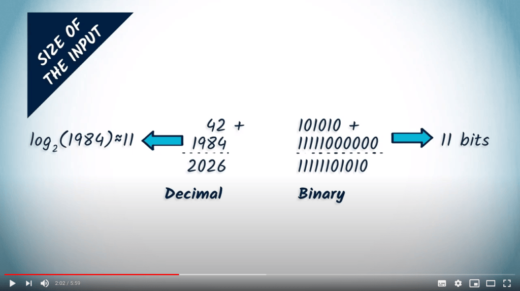 Par exemple, si nous considérons l’addition de deux entiers, la taille serait le logarithme en base 2 du plus grand nombre, correspondant au nombre de bits utilisés pour le représenter en mémoire.