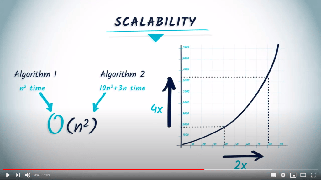Cependant, les constantes n’ont pas d’importance pour la question de la scalabilité, qui examine comment le temps d’exécution de l’algorithme change en fonction de la taille du problème. Bien qu’un algorithme nécessitant $n^2$ temps soit toujours plus rapide qu’un algorithme nécessitant $10n^2 +3n$ temps, pour les deux algorithmes, lorsque $n$ devient suffisamment grand et que la taille du problème double, le temps réel quadruple.