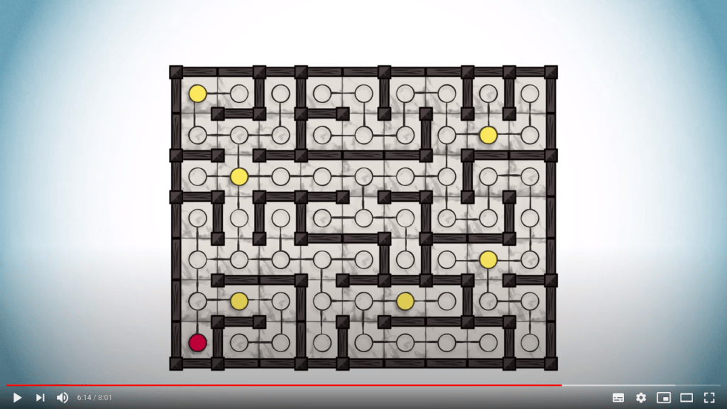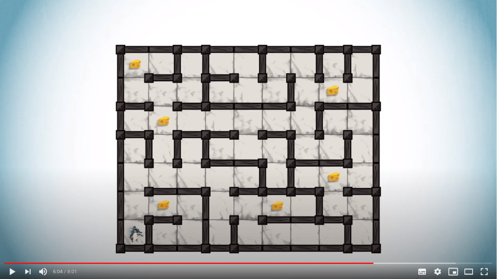 Nous pouvons maintenant résoudre le problème de trouver l’itinéraire le plus court pour ramasser tous les morceaux de fromage. Tout d’abord, nous construisons le méta-graphe. Ensuite, nous résolvons le TSP sur le méta-graphe. Enfin, nous utilisons le routage pour trouver les itinéraires correspondants dans le labyrinthe.