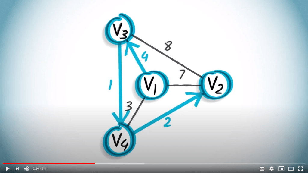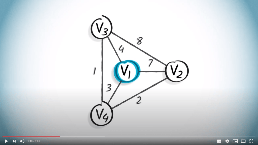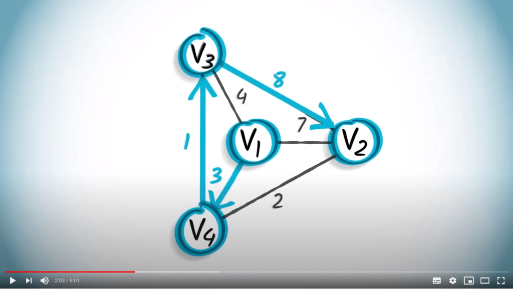 Le chemin $( {v_1,v_3}, {v_3,v_4}, {v_2,v_4}) $ a un poids total de $4 + 1 + 2 = 7$, et c’est le chemin le plus court partant de $v_1$ et passant par tous les sommets du graphe. Ainsi, c’est la solution optimale du TSP pour ce graphe.