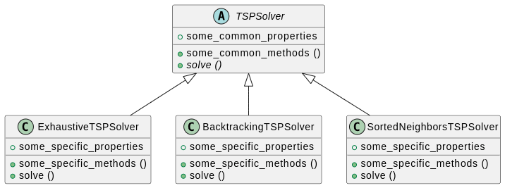 • Classe – Vous pouvez créer une classe abstraite TSPSolver (dans un répertoire utils), qui regroupe les méthodes communes à tous les solveurs exhaustifs. Ensuite, écrivez les classes ExhaustiveTSPSolver, BacktrackingTSPSolver et SortedNeighborsTSPSolver qui héritent de TSPSolver. Enfin, créez un joueur TSPPlayer.py qui utilise le solveur souhaité.