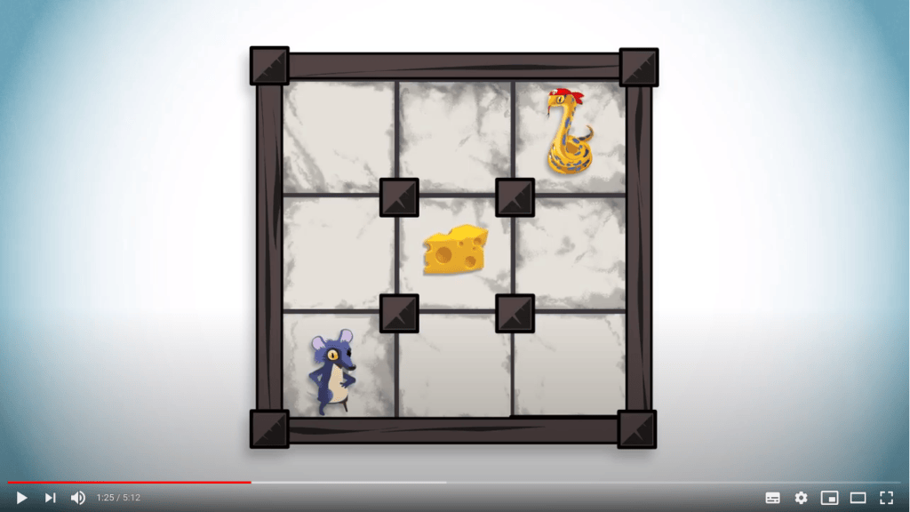 En outre, PyRat est un jeu à “somme nulle”, car un morceau de fromage pris par le joueur ne sera pas pris par l’adversaire.