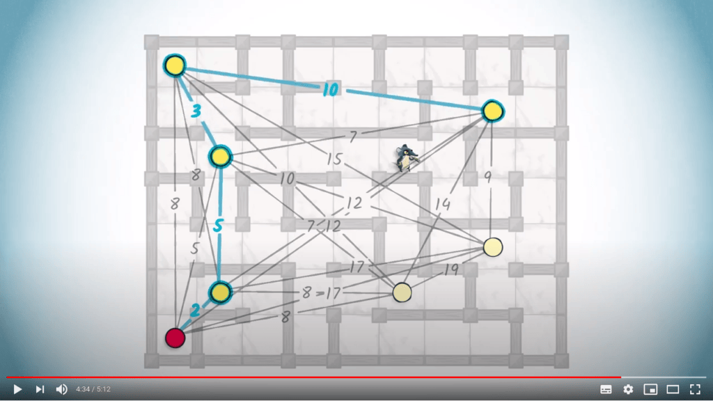 Enfin, PyRat admet un nombre fini de stratégies pures, car le nombre de décisions possibles par sommet de l’arène est un entier. Une stratégie pure est une définition complète de la façon dont un joueur jouera à un jeu. En particulier, elle détermine le mouvement qu’un joueur fera pour toute situation à laquelle il pourrait être confronté. Lorsqu’une stratégie attribue des probabilités à chaque décision, on parle de stratégie mixte.