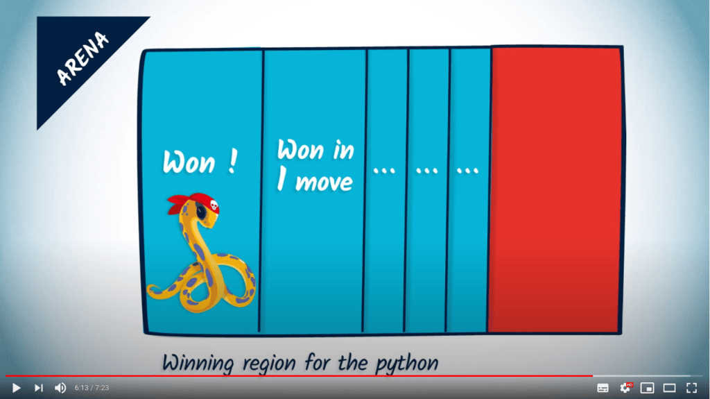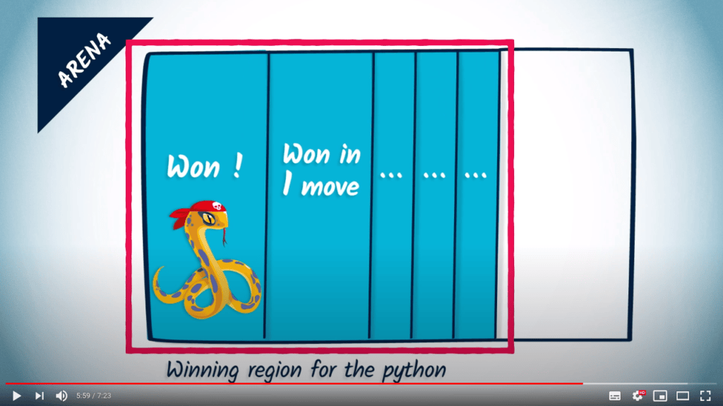 On dit qu’une stratégie pour le rat est “gagnante” si le rat est sûr de gagner la partie, quelle que soit la manière dont le python décide de se déplacer. En d’autres termes, c’est une stratégie telle que, pour toute stratégie de l’adversaire, la partie est gagnée.