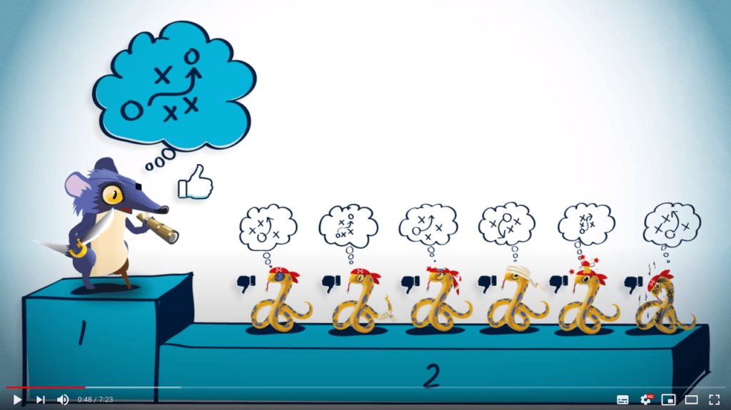 Pour conclure, notez qu’ici nous alternons les décisions entre les joueurs, ce qui implique qu’ils prennent leurs décisions à tour de rôle. Néanmoins, il existe des résultats équivalents pour les jeux simultanés tels que PyRat.