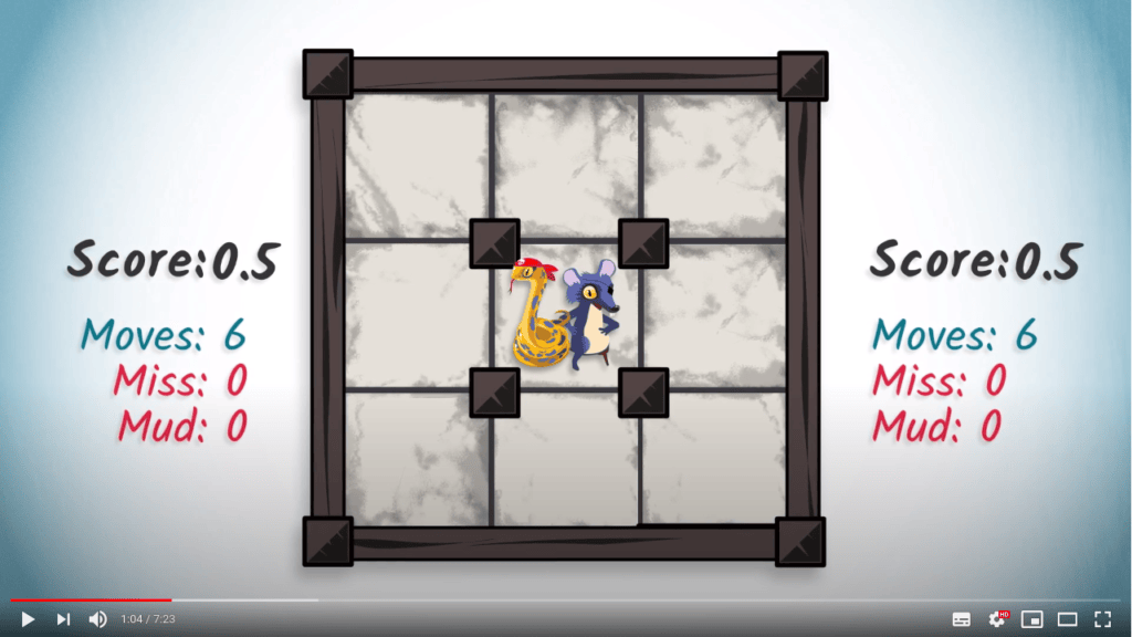 Au début d’une partie de PyRat, il n’y a pas de stratégie gagnante pour aucun des joueurs, car le labyrinthe est symétrique. Par conséquent, si les deux joueurs choisissent la même stratégie, alors le résultat sera une égalité.