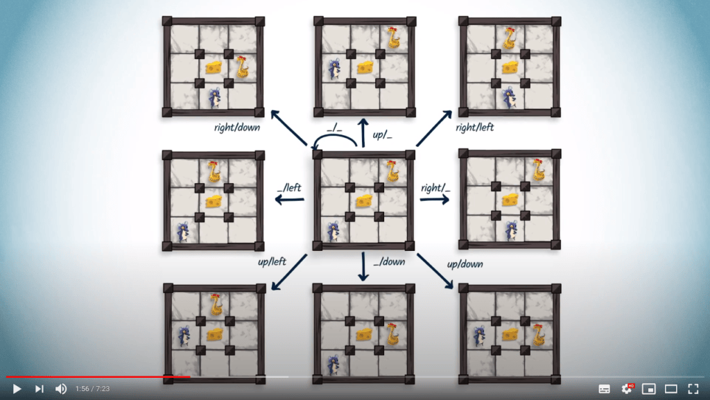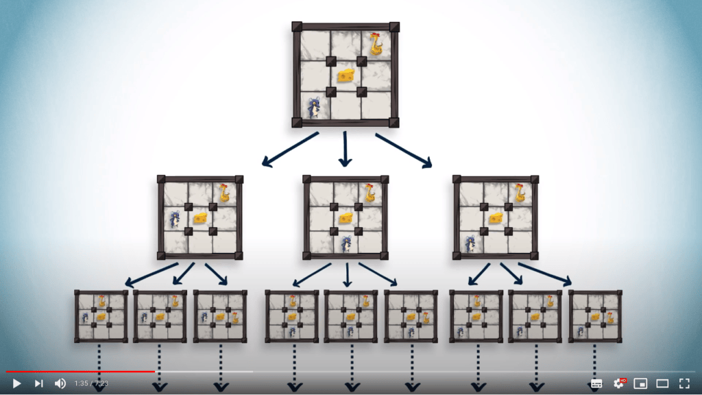 Vous devez noter que cette façon de construire une stratégie gagnante ne peut être calculée que pour un petit labyrinthe avec un nombre limité de morceaux de fromage, et n’est pas vraiment réalisable pour de grands labyrinthes. Quand il s’agit de grands labyrinthes, une meilleure approche consisterait à faire des hypothèses sur les décisions de l’adversaire, ce qui réduirait les facteurs combinatoires.