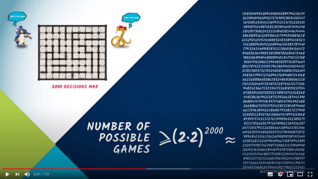En pratique, cela signifie que le calcul des stratégies gagnantes ne peut être effectué que lorsque la variabilité du jeu est réduite, par exemple lorsqu’il ne reste que quelques morceaux de fromage dans le labyrinthe.