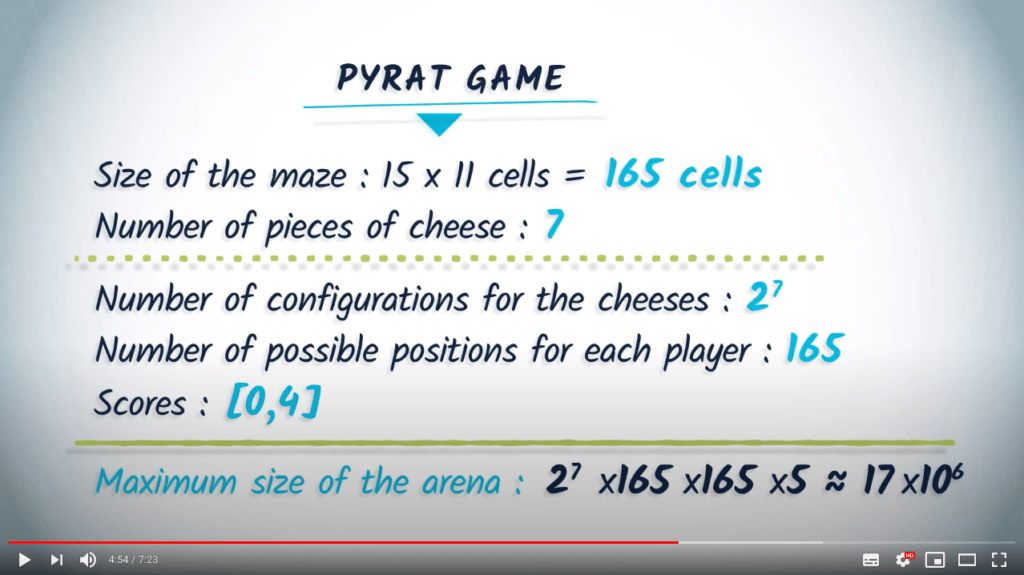 Encore une fois, imaginez une instance de PyRat dans laquelle le labyrinthe contient $15 \times 11$ cellules, soit 165 cellules, et disons qu’il y a 7 morceaux de fromage. Notez que nous n’avons pas besoin de conserver les emplacements réels des morceaux de fromage, car ils ne bougeront pas pendant le jeu, mais nous devons seulement retenir lesquels ont été mangés et lesquels sont encore dans le labyrinthe. Donc dans cet exemple, il y a 2 configurations possibles pour chacun des 7 morceaux de fromage, ce qui fait un total de $2^7$ configurations possibles. De plus, il y a 165 positions possibles pour chaque joueur. Concernant les scores, nous n’avons besoin de stocker que le score d’un joueur, car cela, avec les morceaux de fromage restants, peut être utilisé pour récupérer le score de l’autre joueur. Il y a donc 5 scores possibles pour un joueur, entre 0 et 4. Finalement, il y a un maximum de $2^7 \cdot 165 \cdot 165 \cdot 5 \approx 17~\text{millions}$ de sommets dans l’arène.
