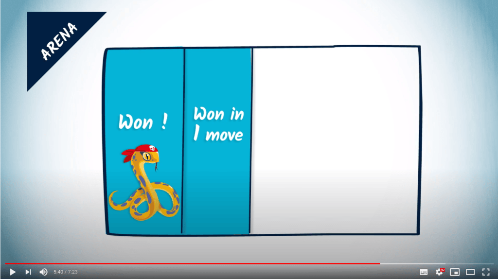 Si vous êtes à un sommet donné dans l’arène, pour trouver le meilleur mouvement, celui qui vous maintient dans la région gagnante de l’arène, vous devez prendre en compte tous les choix ultérieurs possibles de l’adversaire. Dans un jeu comme PyRat, le nombre de telles combinaisons est probablement trop grand pour être traité.