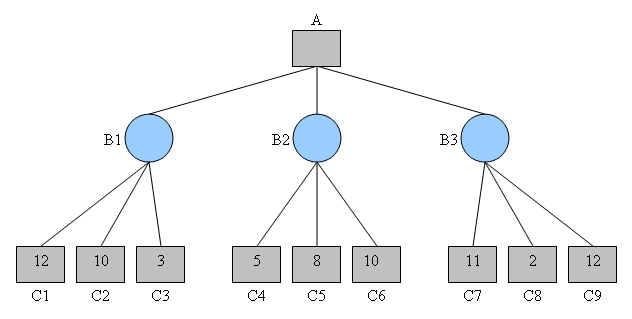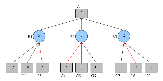 Ce que cela signifie maintenant, c’est que, si j’atteins l’état du jeu $B1$, l’adversaire jouera de sorte que notre gain total soit 3, obtenu à partir de l’état $C3$. Si nous faisons en sorte que le jeu aille à l’état $B2$, notre adversaire peut jouer de sorte que le gain soit 5 en imposant l’état $C4$. Enfin, si nous jouons pour atteindre la situation $B3$, l’adversaire peut jouer de sorte que le gain soit 2 en imposant l’état $C8$.
